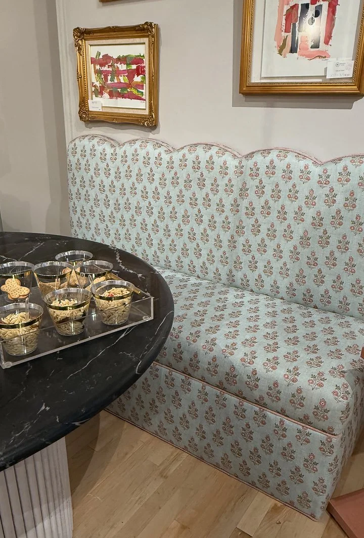 The scallops on this breakfast bench remind me of the whimsy of Dorothy Draper’s midcentury style.